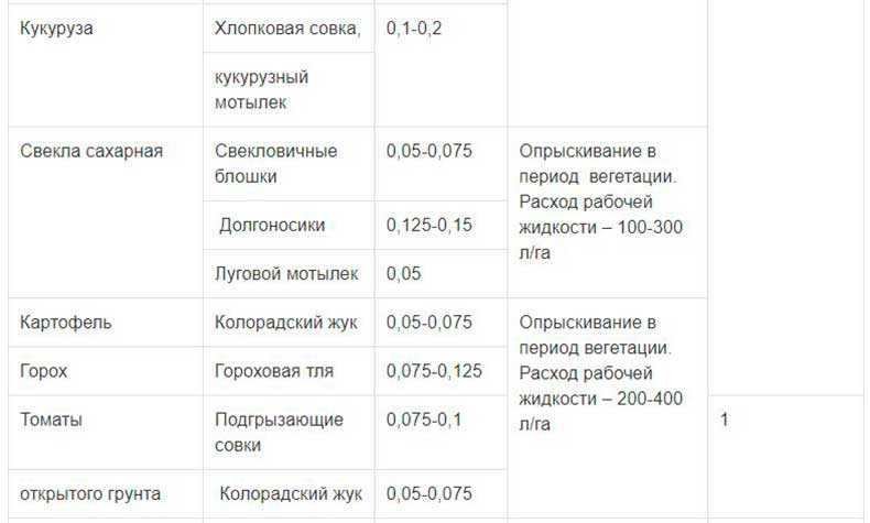 Инсектицид широкого спектра действия, активен в борьбе с жесткокрылыми (Coleoptera), чешуекрылыми (Lepidoptera), равнокрылыми (Homoptera), двукрылыми (Diptera), полужесткокрылыми (Hemiptera), трипсами (Thysanoptera), прямокрылыми (Orthoptera) и другими вредителями.